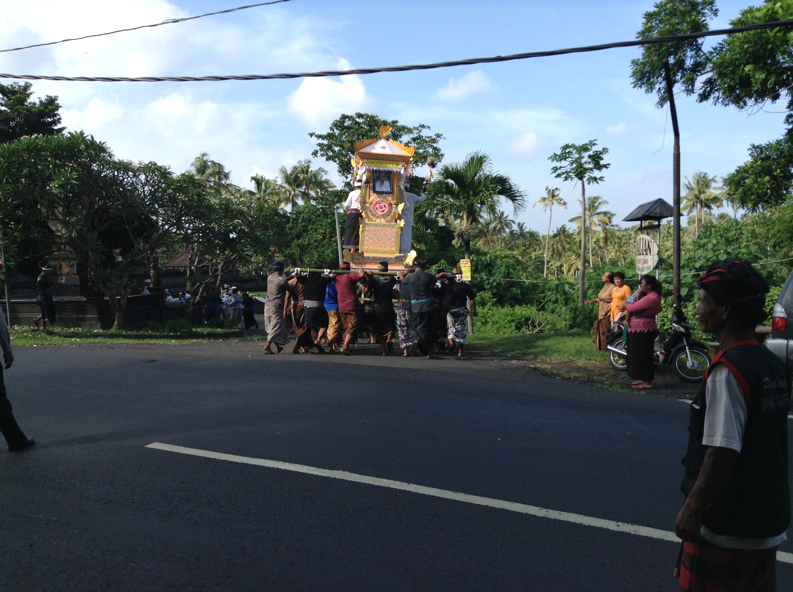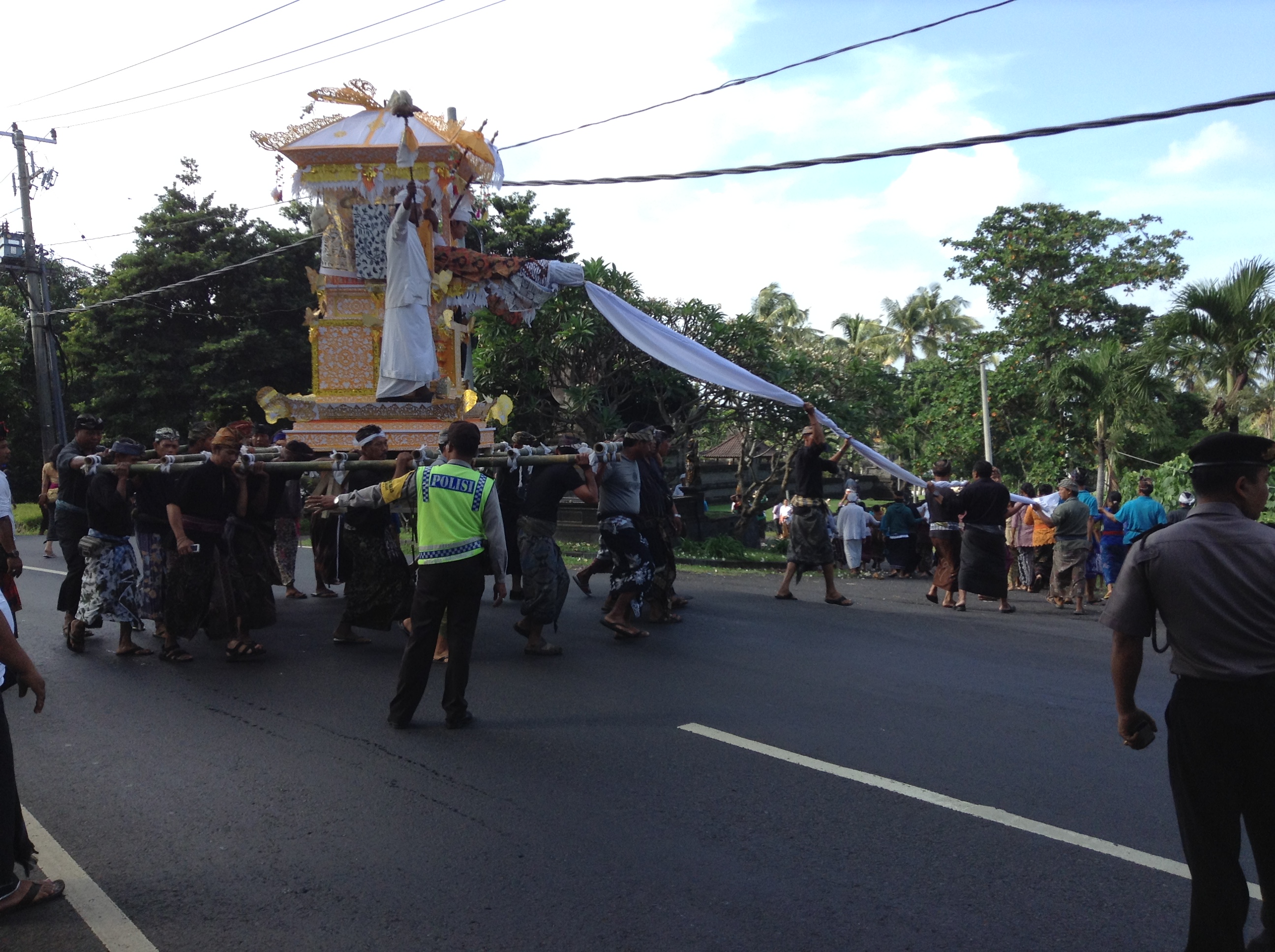 Conocimos a Nyoman, primo de Wayan y chófer al servicio de la familia de la señora que varios meses atrás había muerto de cáncer y que ahora cremarían. Los temas de nuestra conversación fueron varios y variados: nos preguntó qué tan mal nos habían tratado los musulmanes en Java; si estábamos consientes del problema en el que nos habíamos metido por comprar motos en lugar de rentar; si éramos casados o, como muchos bules, andábamos en busca de esposas balinesas; y si en México de verdad estaba tan jodido el tema del narco y la inseguridad.