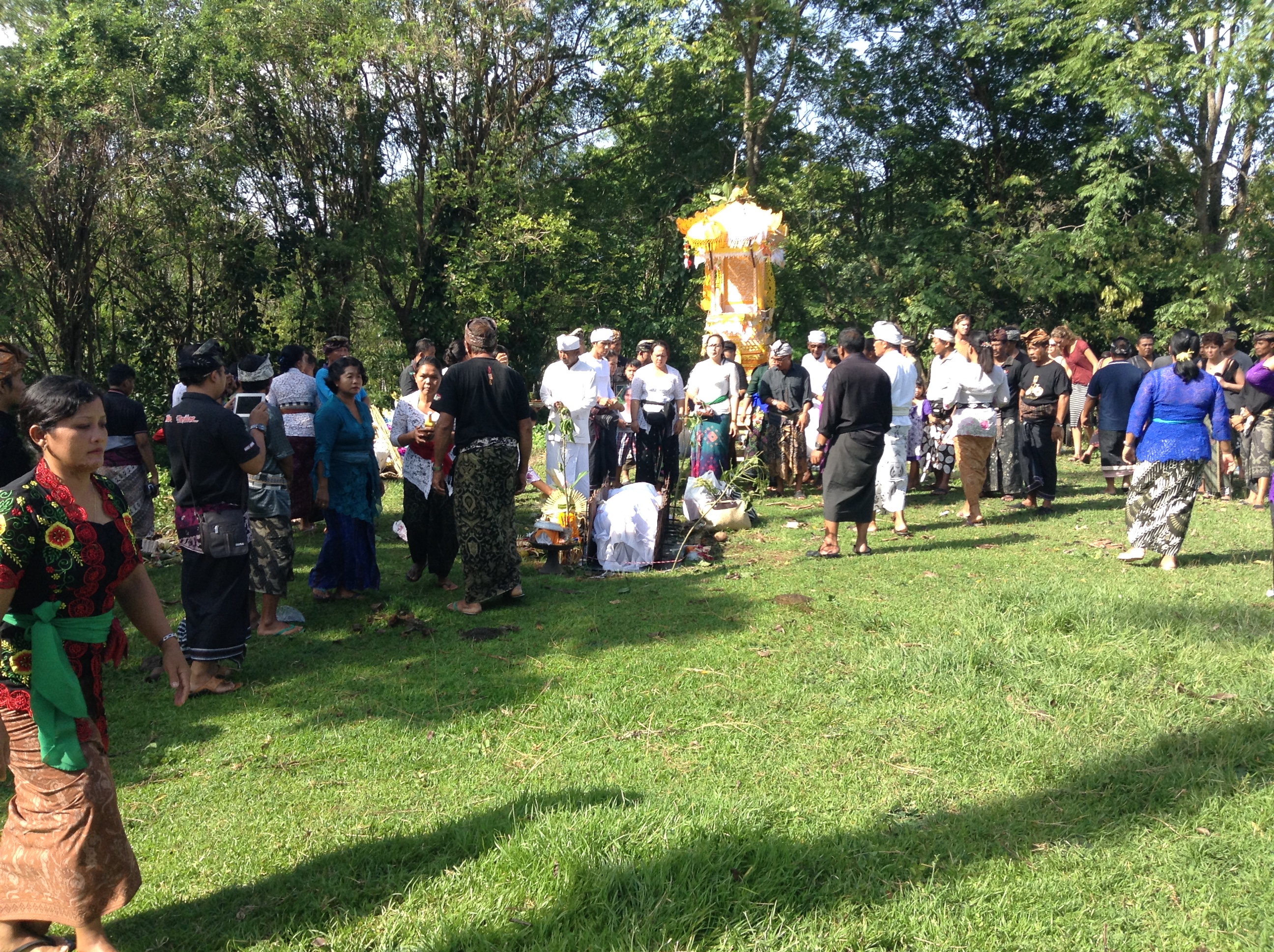 Comenzaron otras bendiciones, ahora coordinadas por Ketut, el banjar o jefe del pueblo, y luego se acercaron familiares y amigos a colocar ciertos objetos apreciados por la señora o que representaban la amistad que habían tenido con ella.