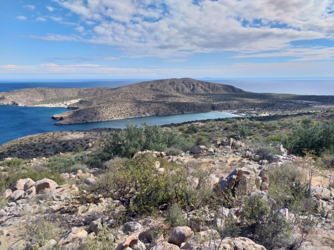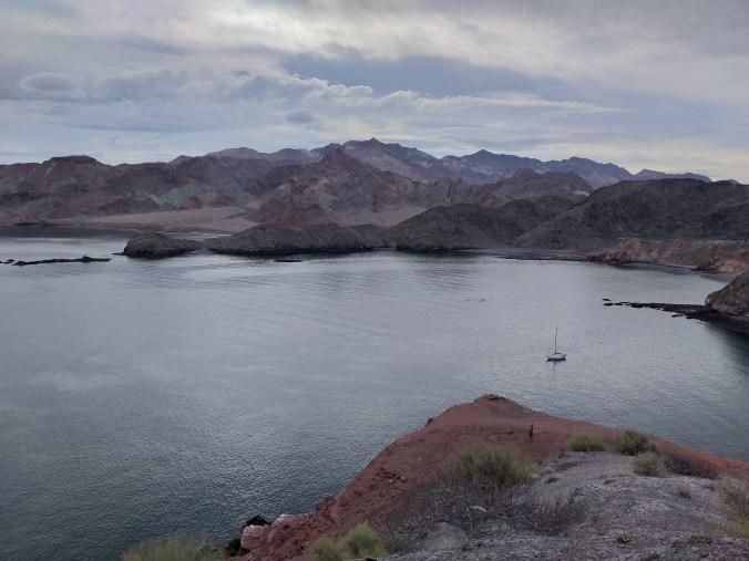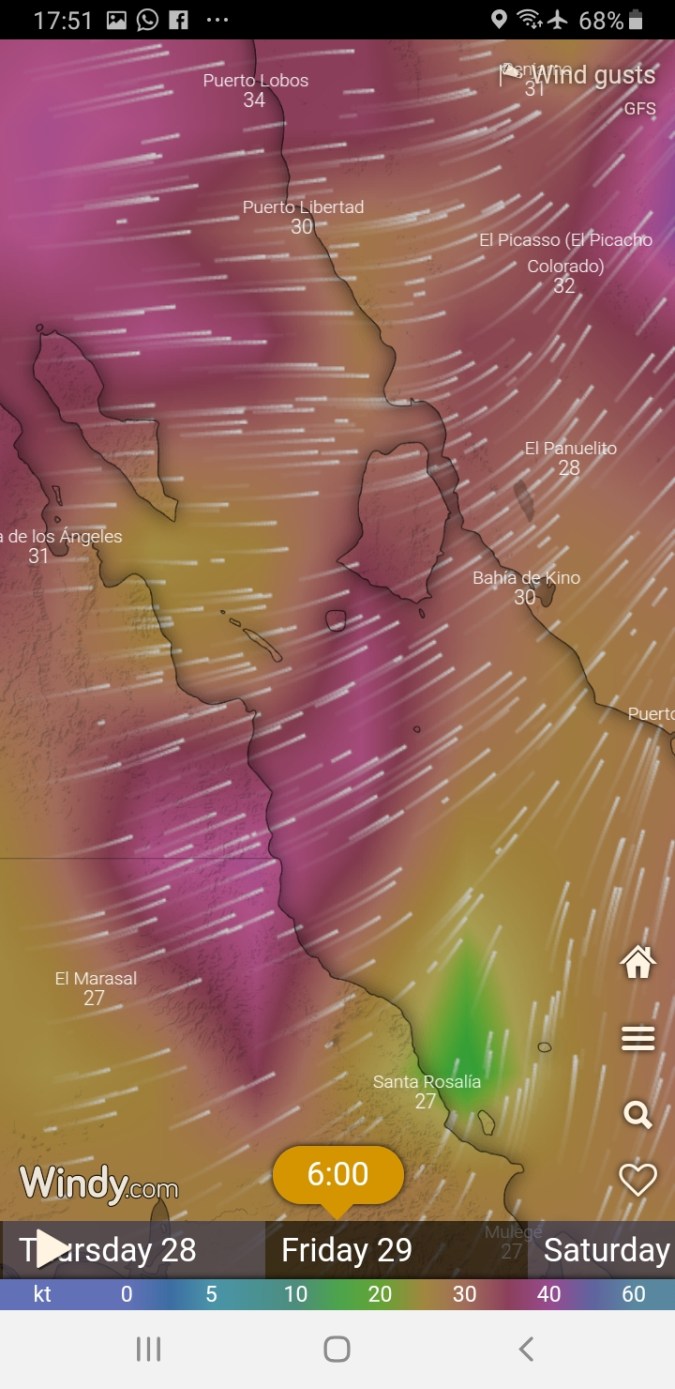 Ayer, 29 de enero, con un nuevo ancla de 25 libras tipo Rocna que un velero vecino le vendió en Puerto Balandra, Isla Carmen (donde también arrastró un par de veces), ancló al sur de la entrada a la Bahía de Puerto Escondido, justo a tiempo para refugiarse de otro Weste. Este ancla parece estar funcionándole mucho mejor que aquel Danforth de 25 kilos que solía usar y que tantas veces le quedó mal.