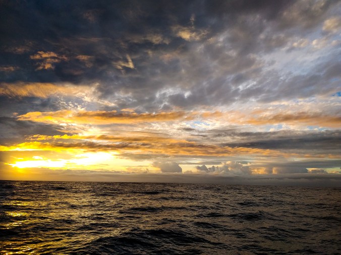 Mi mañana empieza durante una tormenta. Suelo despertarme diez minutos antes de mi turno para prepararme un café. Aquí es imposible, el barco azota de lado a lado y el ruido de la lluvia ensordece. Me asomo a preguntarle a Tom si requiere ayuda. Para mi desgracia, asiente. Tomo mi chaleco salvavidas, lo engancho a una correa que a su vez está enganchada al palo de la Mesena (vela de popa) y salgo a emprender el día en una lluvia que pega lastimosamente de lado y un viento de 35 nudos. Llevamos un foque de batalla y la Mesena con dos rizos. El barco soporta el azote de maravilla, así que decidimos dejarlo cómo está y tomo el timón. Abajo es otra historia: tenemos goteras en todas las escotillas, al pie del mástil y en otros lados no identificables. A las 0830 cambiamos el foque por la Genovesa y bajo a desayunar un mango. No puedo dejar que se nos pudran. A las 1030 izamos la Mayor y echamos las líneas de pesca. El día trascurre plagado de tormentas cortas seguidas de poco viento. A ratos usamos el motor para mantener un rumbo norte y así acortar la distancia que nos separa de los vientos mercantes, dónde con suerte ya no habría tormentas. La lluvia deja el interior empapado y resbaloso. Ahora le toca al gato disfrutar de vernos patinar de lado a lado.