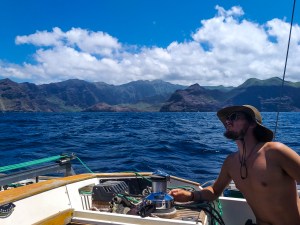 La moral volvió a las 1500 cuando llegamos al abrigo de la isla en su costa oeste. En un mar plano, de verdes y azules, pescamos un barrilete de buen tamaño, alimento por varios días. Eran las siete cuando dejamos atrás Nuku Hiva. Comenzaba mi turno a un promedio de seis nudos (11km/hr), vientos del este de 15 nudos y embistiendo olas que nos llegaban del noreste. Estimábamos 2 a 3 semanas de navegación nor-noroeste para llegar a Hawái, con vientos preponderantemente del noreste y olas del este-noreste. En resumen, una batalla contra el viento y el mar. Al llegar las estrellas, caí en cuenta que de esa noche en adelante el cielo cambiaría constantemente hasta ubicarme en latitudes conocidas. Cada noche empezaría un poco después y sería un poco más larga. La luna iría desapareciendo y todos los días entre las 1900 y las 2300 me tocaría navegar en un escenario distinto.